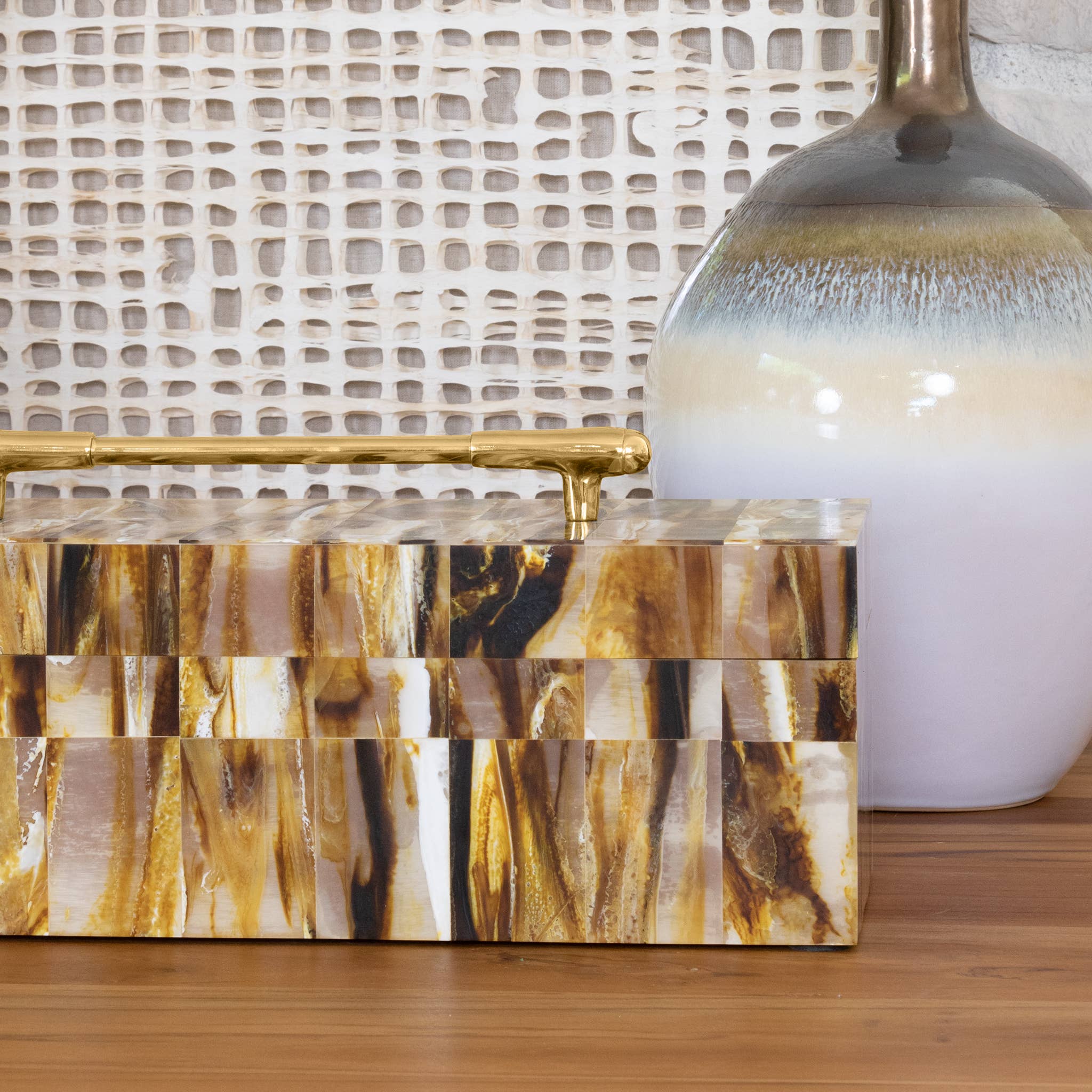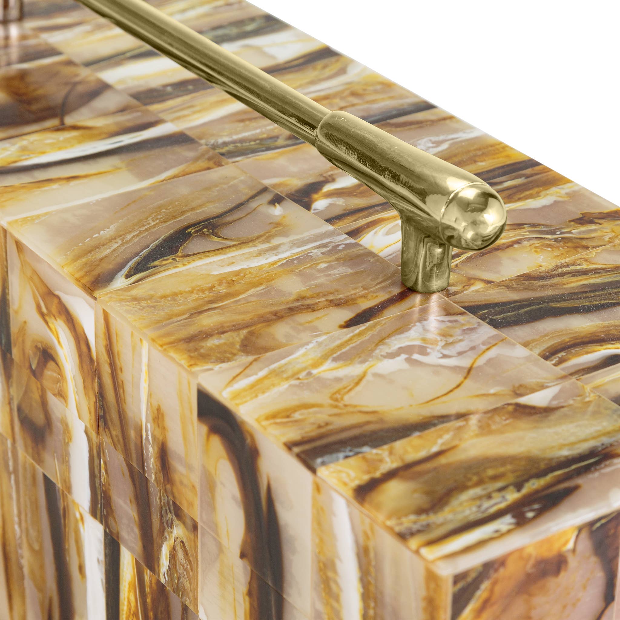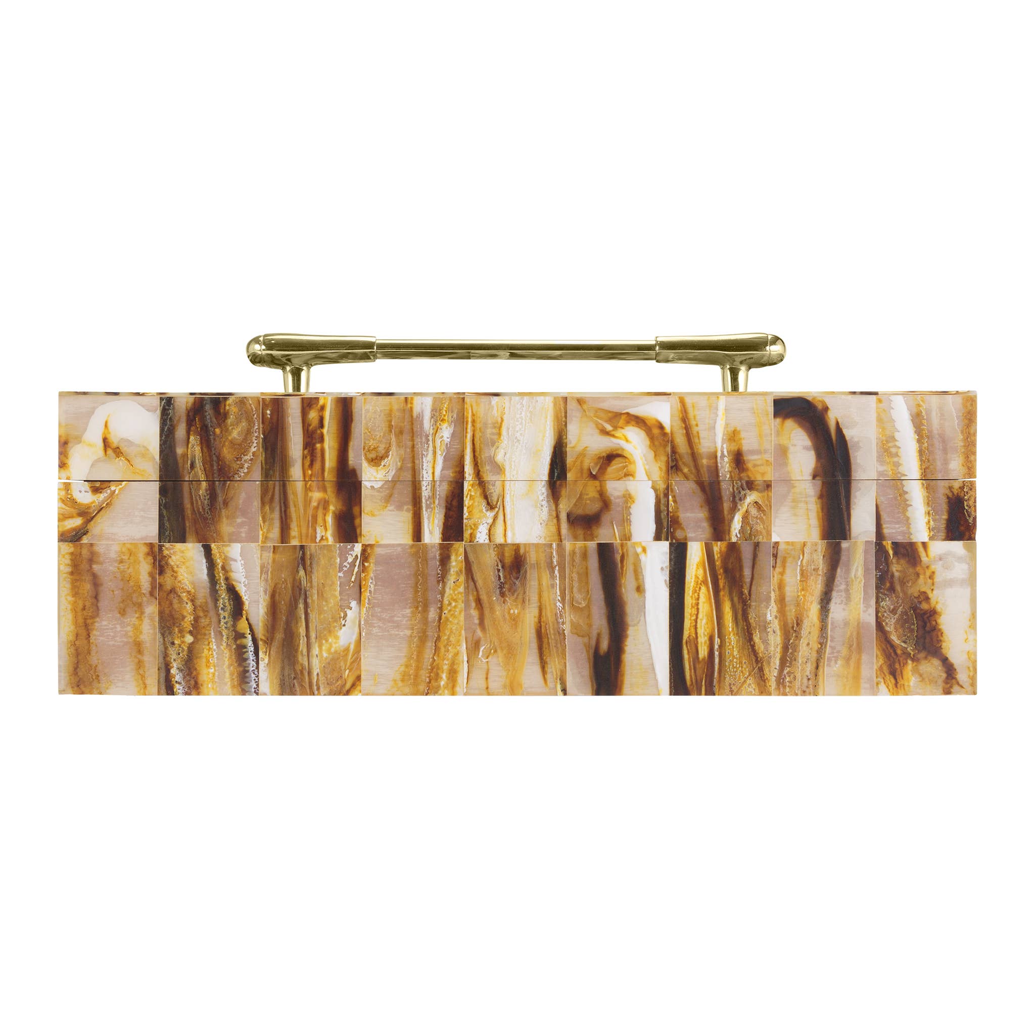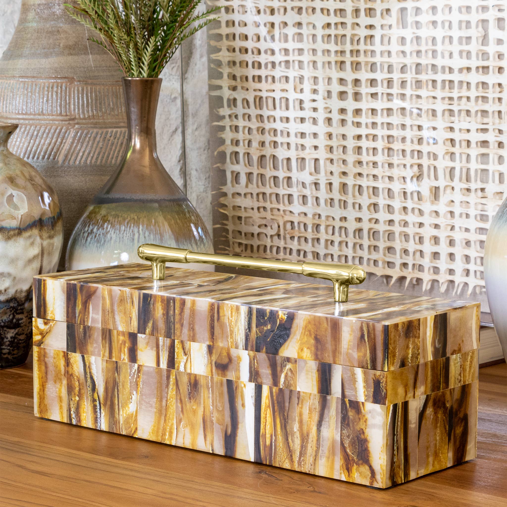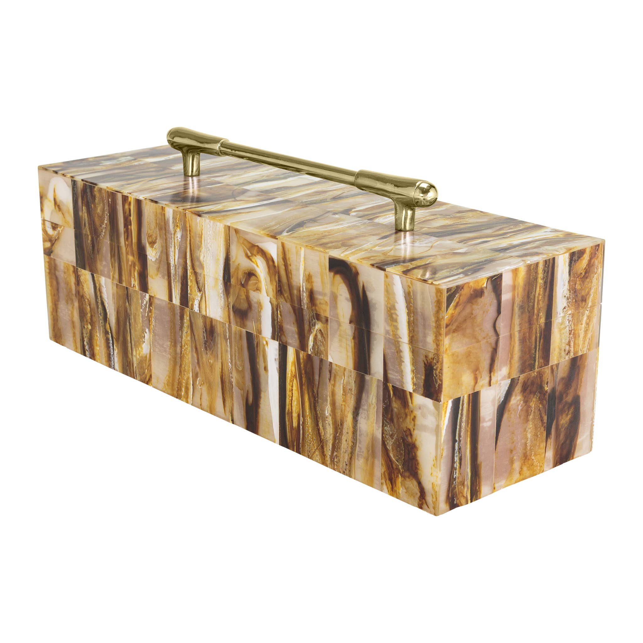 The Eliza Geometric Decorative Box embodies elegance and functionality in a masterfully crafted design. This rectangular resin box commands attention with its mesmerizing pattern of swirling browns and golds. The exterior showcases a captivating marbled effect that creates visual movement across its surface, while a luxurious gold-finished handle crowns the removable lid, striking a perfect balance between sophistication and practicality. Its sleek, modern silhouette is complemented by a warm brown MDF interior, offering both aesthetic appeal and storage utility. This versatile piece features clean lines and a contemporary form that allows it to seamlessly integrate into various decor styles, from minimalist modern to traditional elegant spaces. This box's thoughtfully considered proportions make it an ideal decorative accent for shelves, console tables.