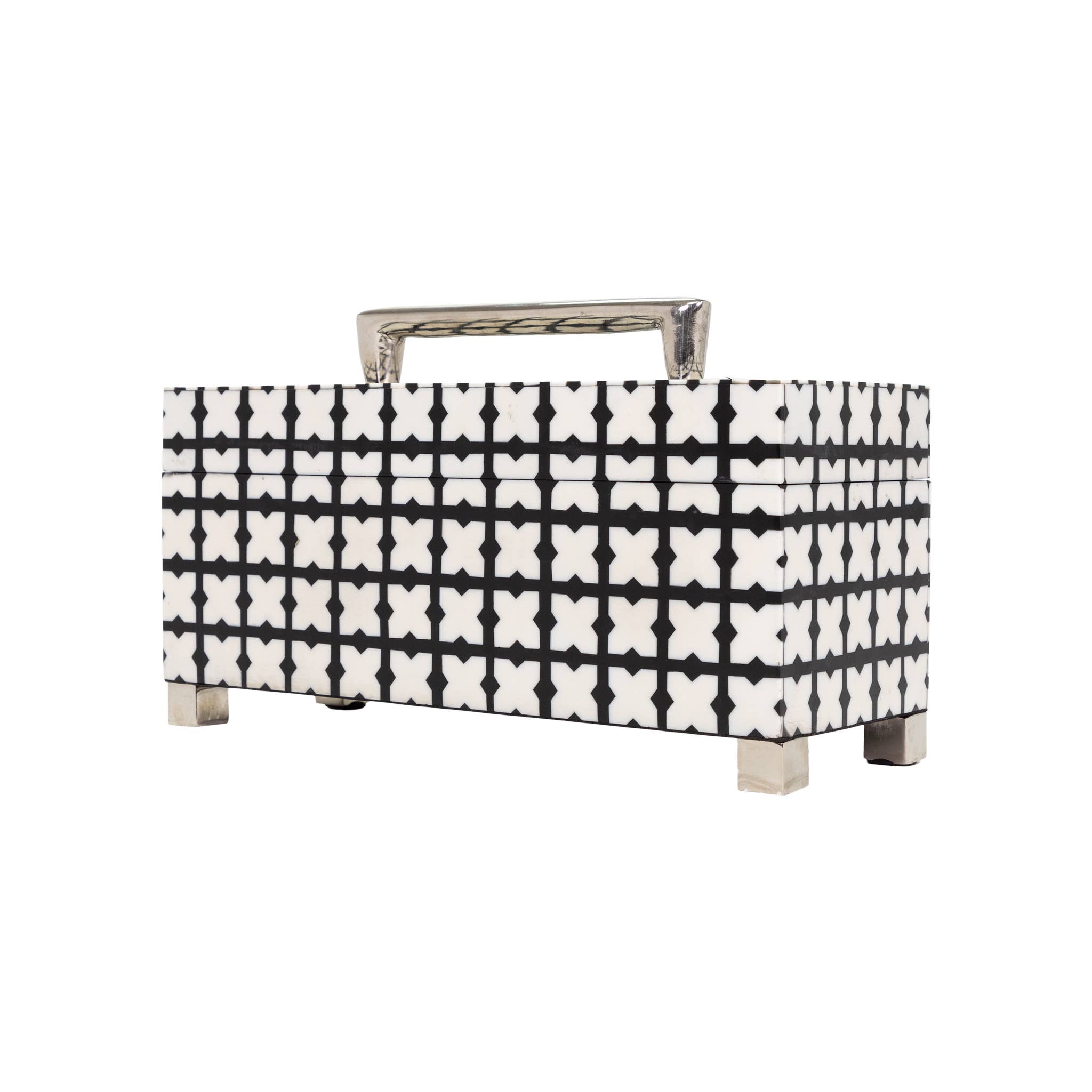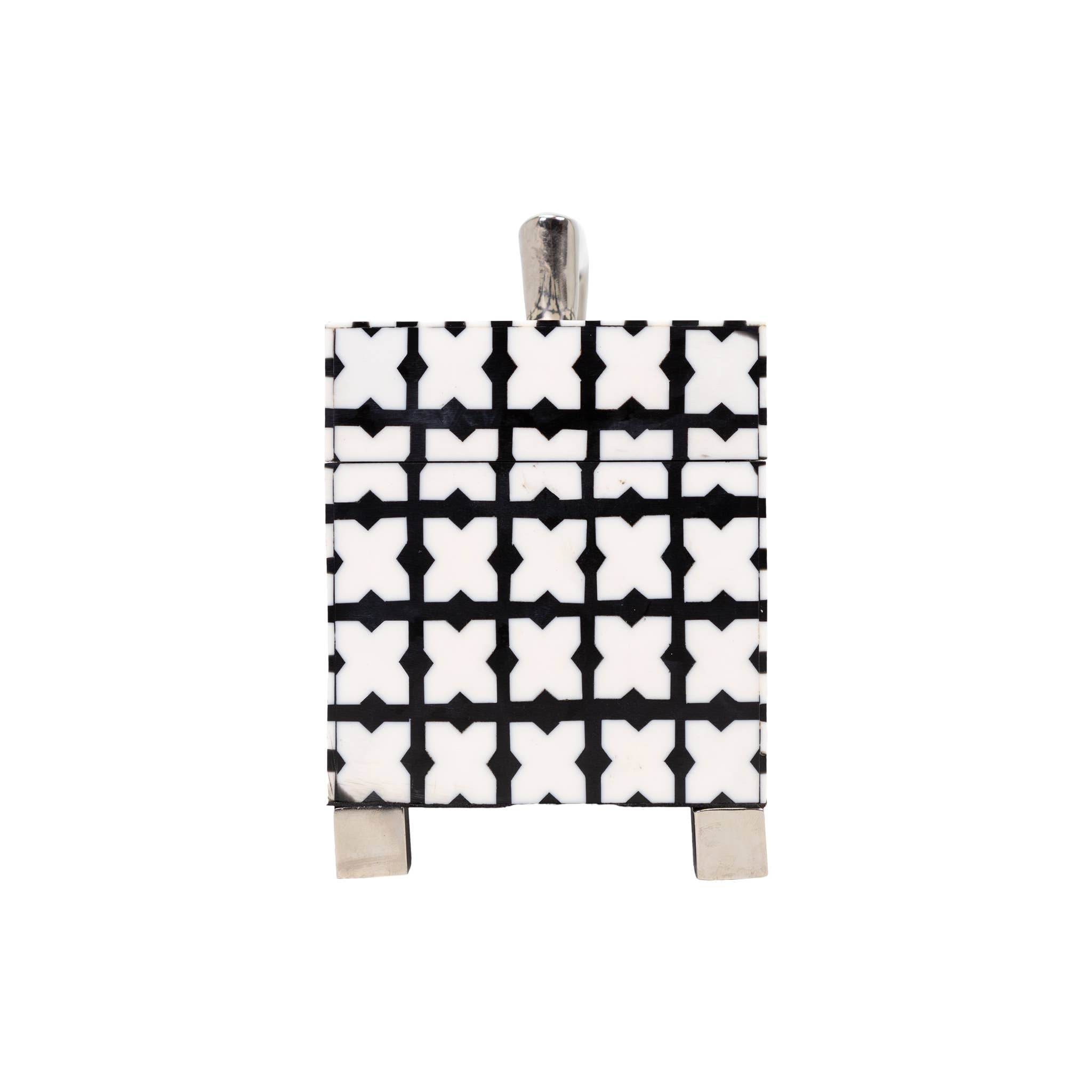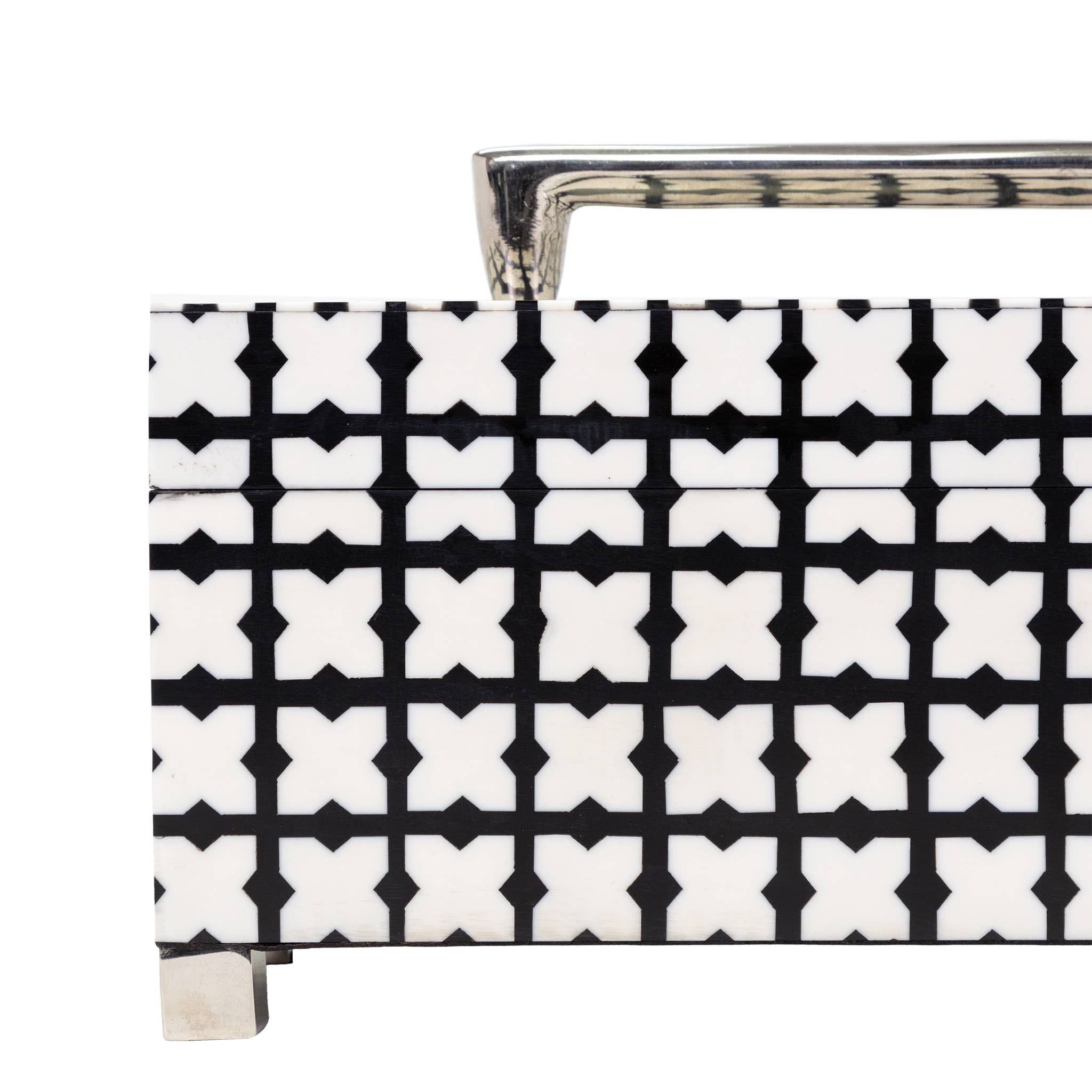 This decorative box exudes modernity and elegance, thanks to its eye-catching black and white geometric pattern. The sleek silver aluminum handle and feet add a chic touch, making it a statement piece for any room.  It offers ample storage space while effortlessly blending into your home decor. The removable lid ensures easy access to your belongings, providing a practical yet stylish solution. Discover the perfect combination of fashion and function with the Jolene Box.