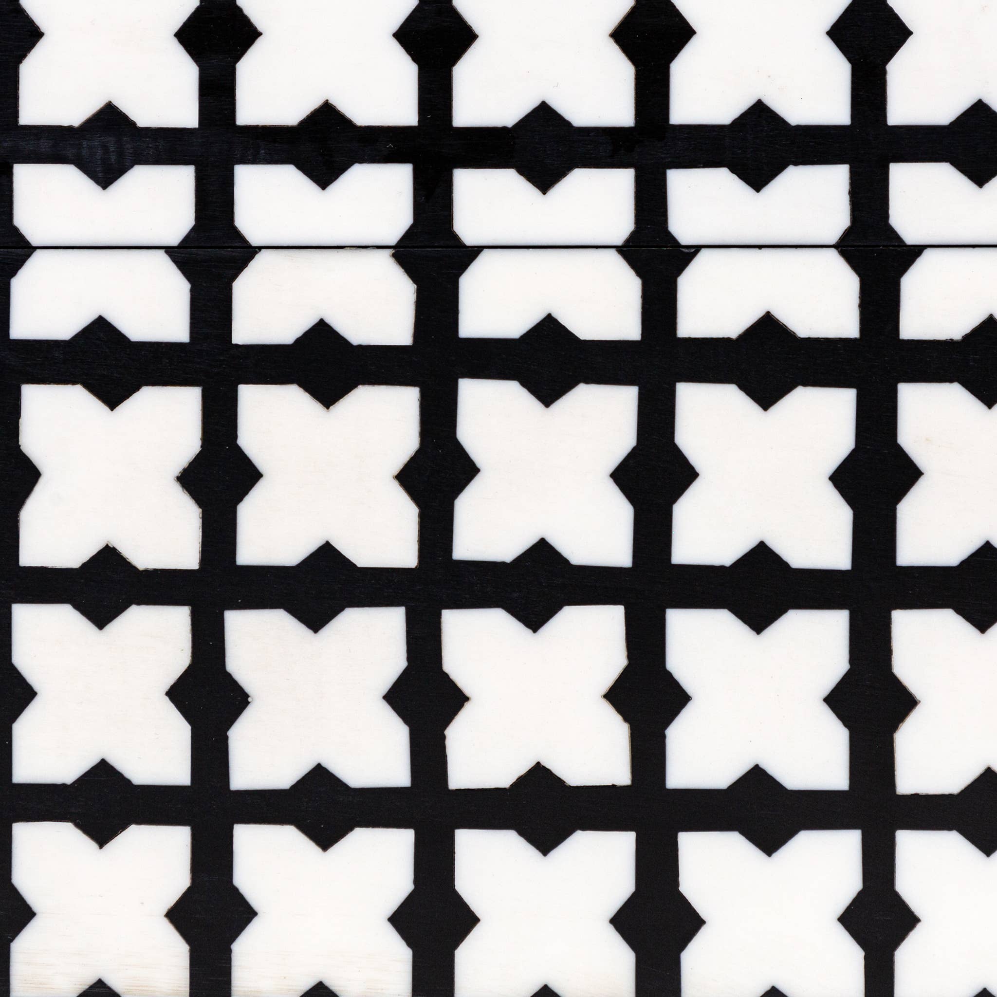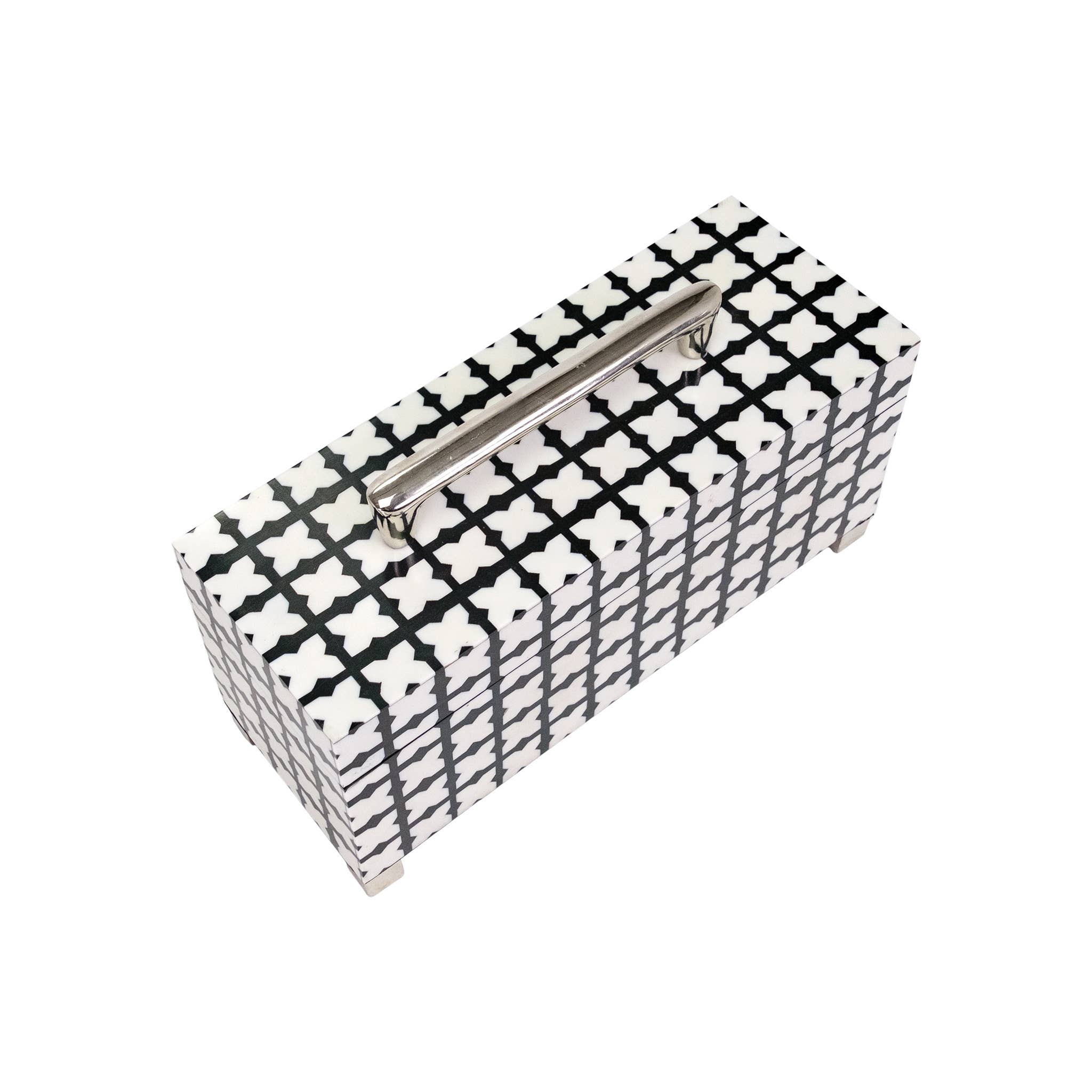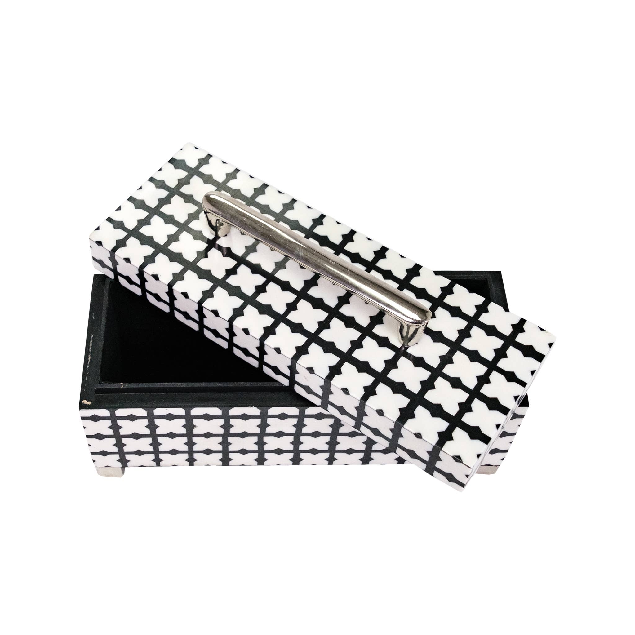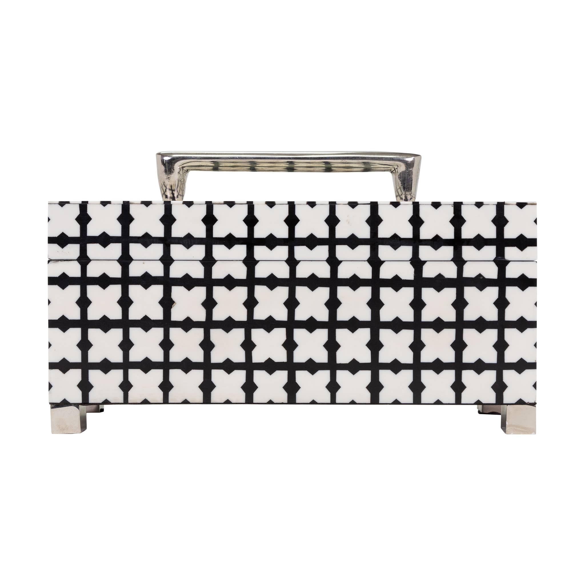 This decorative box exudes modernity and elegance, thanks to its eye-catching black and white geometric pattern. The sleek silver aluminum handle and feet add a chic touch, making it a statement piece for any room.  It offers ample storage space while effortlessly blending into your home decor. The removable lid ensures easy access to your belongings, providing a practical yet stylish solution. Discover the perfect combination of fashion and function with the Jolene Box.