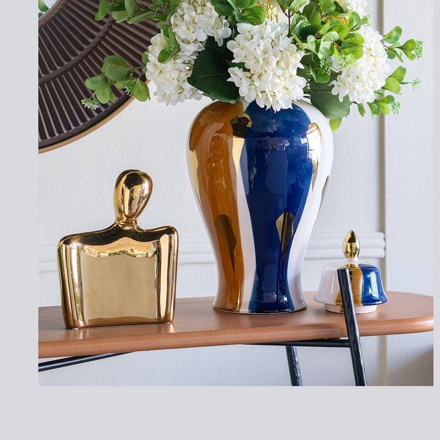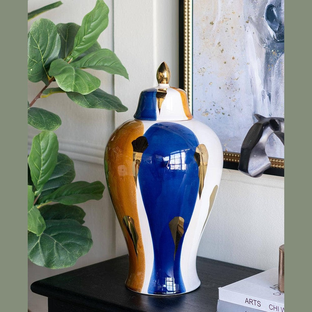 Crafted from 100% crisp ceramic, this stylish ginger jar brings a fresh burst of life to classic designs. Finished in an abstract blend of blue, white, and gold tones, it will capture the eye as a standalone accent or when paired with a colorful flower or branch arrangement.